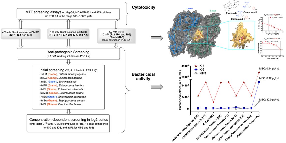 The aims of the current project could be feasible due to an integral and interdisciplinary technology approach that we are tackling starting from rational design of small molecular compounds, virtual screening, synthesis, biological screening and in relevant bacterial strains including Paenibaccilus larvae and in vitro evaluation of cytotoxic efficacy of the new generation antibacterial agents with possible anticancer activity. In the scope of our project, we also aim to create new collaborations for future oriented research not only in this specific area of human health and quality of life. The applied approach is illustrated as a part of our investigations in the Figure below.